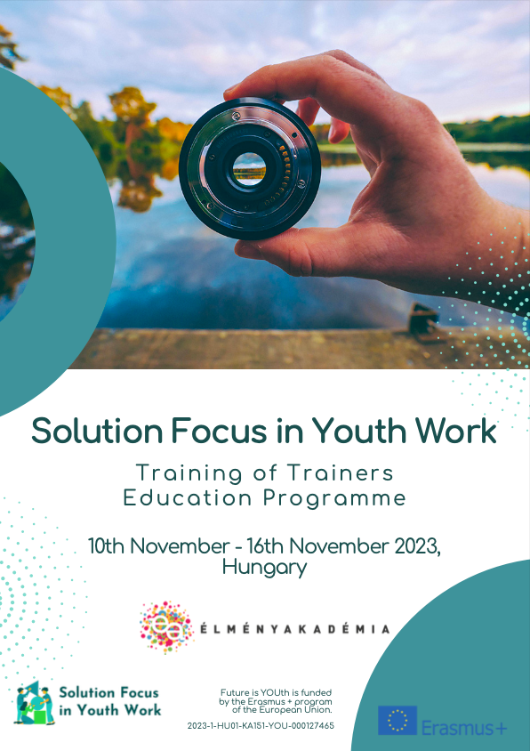 Training for trainers: Solution Focus in Youth Work Dates: 10. - 16. November 2023 Venue: Balatonboglár, Hungary Participation fee : 30€ (incl. free accommodation and meals, travel costs can be reimbursed according to the travel distance) Read the info pack for detailed information and conditions. The training program spans 5 days, focusing on in-depth understanding of solution focus approach, and principles. What are the intentions/objectives of the training? to develop the coaching skills of youth workers and support professionals to enable participants to consciously lead their discussions or group processes in a way that supports their clients and participants on their path to change transfer and promote the basic concept of the solution-focused paradigm/approach support participants to develop their own practice in leading discussions and facilitating group processes create space for participants to work with their own issues, questions and challenges, experiencing first-hand what facilitative conversation around resources looks like to reflect together on how they can apply SF practice in their everyday work. Organizer is our Hungarian partner organization "Academy of Experience" (Elmenyakademia). Contact: titanilla.garabas@elmenyakademia.hu Find more information and the link to the application form in the info pack *This project is financed by the Erasmus+ program of the European Union*