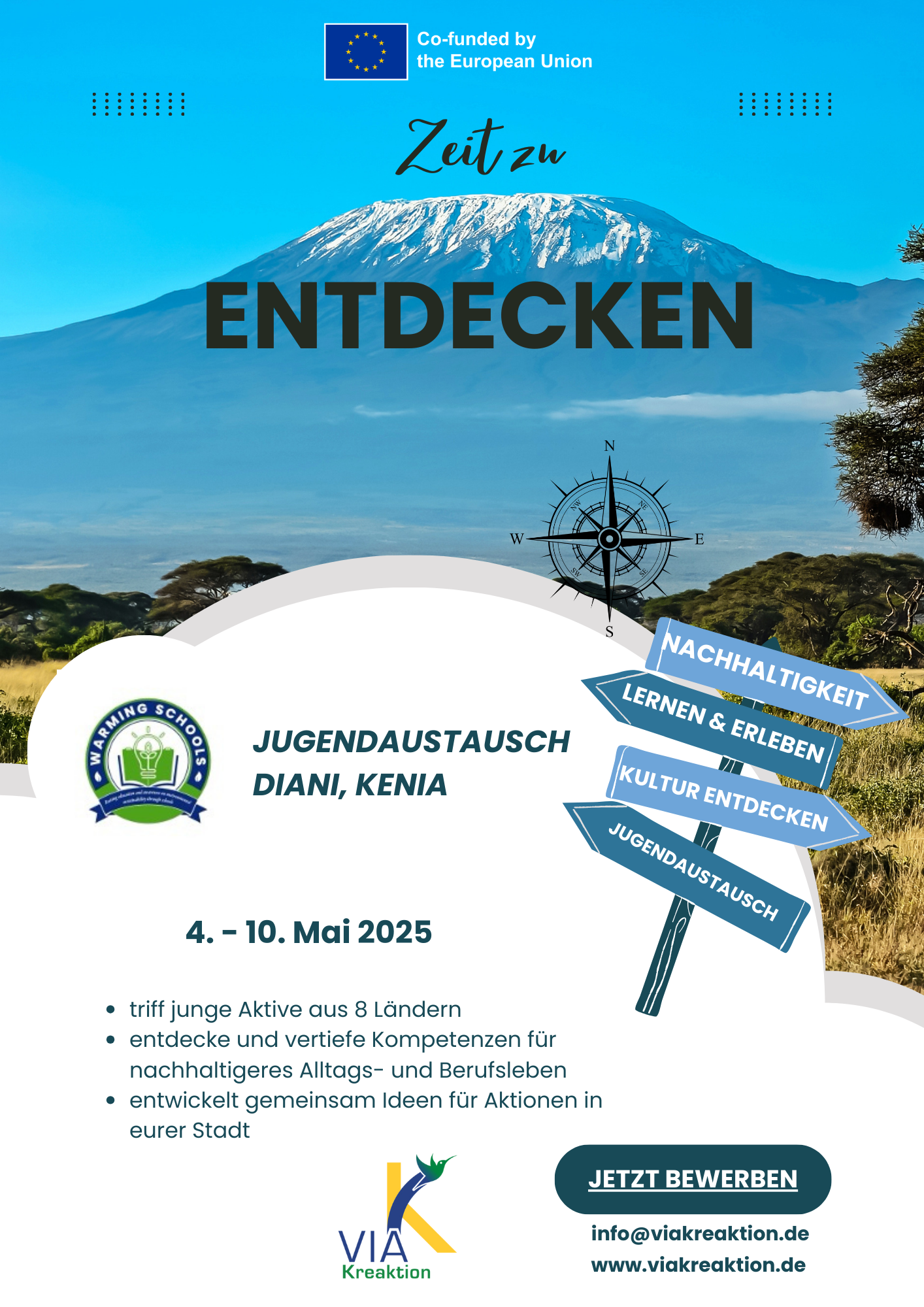 Jugendaustausch "Warming Schools" Projekt 4. - 10. Mai 2025 triff junge Aktive aus 8 Ländern entdecke und vertiefe Kompetenzen für nachhaltigeres Alltags- und Berufsleben entwickelt gemeinsam Ideen für Aktionen in eurer Stadt Teilnehmer gesucht! Du bist 18 - 25 Jahre alt bist offen für kulturellen Austausch mit jungen Erwachsenen aus verschiedenen Ländern hast Interesse an Nachhaltigkeit und willst gerne mehr lernen über nachhaltige Entwicklungsziele, Umwelt und Klimaanpassung bist bereit, dich auch nach der Reise in deiner Stadt in einer Aktion für Nachhaltigkeit einzusetzen hast Grundkenntnisse in Englisch, um dich während des Austauschs mit anderen zu verständigen lebst in Deutschland und hast einen gültigen Reisepass* Der Austausch Februar: Vorbereitungstreffen in Kleve 4. - 10. Mai Austausch in Diani (Mombasa), Kenia - 5 Teilnehmer + 1 Gruppenleiter aus Deutschland reisen gemeinsam an. Insgesamt 40 Teilnehmer aus Kenia, Somalia, Tanzania, Ruanda, Schweden, Deutschland, Italien und Slovenien. Juni/Juli: Nachbereitung und Nachhaltigkeitsaktion in deiner Stadt Gehe zum "Infopack" für mehr Information zum Austausch. Bewerbungsfrist ist 31.01.2025 Fülle das Bewerbungsformular über den Button "jetzt bewerben" aus. Bei geeigneten Bewerbern werden die Plätze auch schon vorher vergeben.